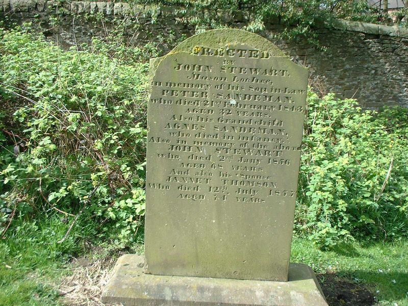 Erected By JOHN STEWART Mason Lochee in memory of his Son in Law PETER SANDEMAN who died 21st February 1843 aged 32 years also his grandchild AGNES SANDEMAN who died in infancy also in memory of the above JOHN STEWART who died 2nd Jany 1856 aged 68 years also his spouse JANET THOMSON who died 12th July 1857 aged 74 years
