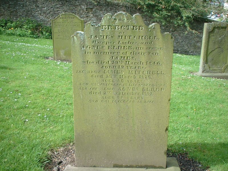 1847 Erected by JAMES MITCHELL Warper Lochee and AGNES ELDER his spouse in memory of their son JAMES who died 29th March 1846 aged 19 years the above JAMES MITCHELL died 29th march 1879 aged 80 years and was interred Liff Churchyard also the above AGNES ELDER died 2nd September 1882 aged 81 years and was interred in Liff
