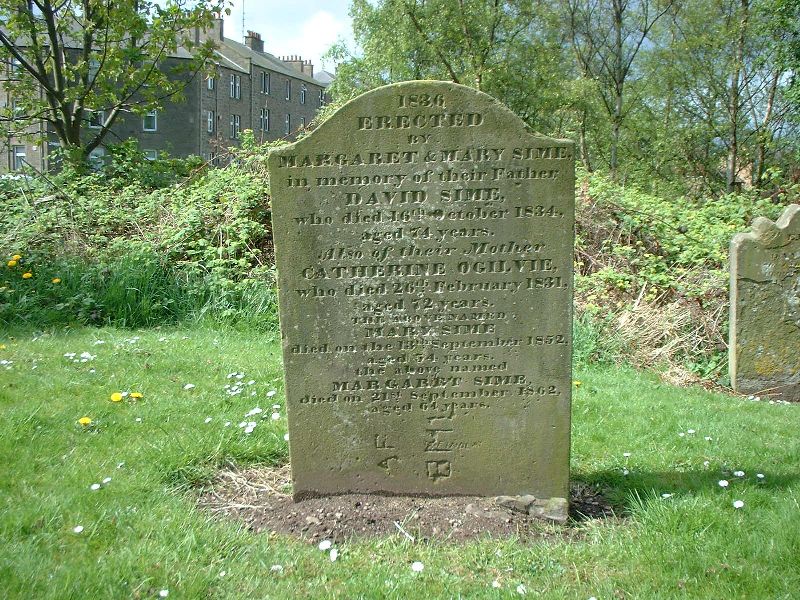 1836 Erected By MARGARET & MARY SIME in memory of their father DAVID SIME who died 16th October 1834 aged 74 years CATHERINE OGILVIE who died 26th February 1831 aged 72 years The above named MARY SIME died on the 18th September 1852 aged 54 years The above named MARGARET SIMES died on the 21st September 1862 aged 64 years