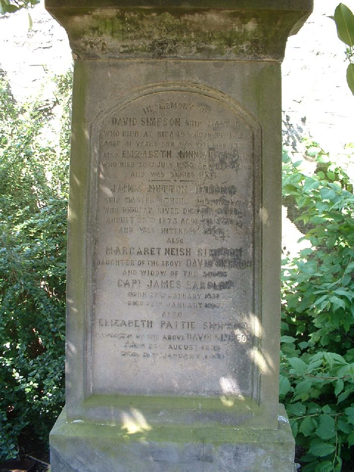 James Hutton Barclay shipmaster their son in law who died at River Du Loup Canada August 28th 1873 aged 41 years and was interred there Also Margaret Neish Simpson daughter of the above David simpson and widow of the above Capt James Barclay Born 27th January 1837 Died 23rd January 1903 Also Elizabeth Pattie Simpson Born 25th August 1839 Died 31st January 1933
