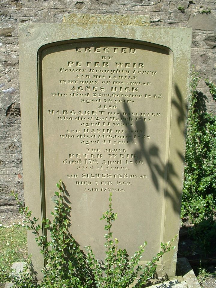 Erected By Peter Weir Feuar Broughty Ferry and his family In memory of his spouse Agnes dick who died 22nd October 1842 aged 76 years also Margaret his daughter who died 2nd March 1818 aged 14 years and David his son who died 14th June 1838 aged 44 years The above Peter Weir died 17th April 1850 aged 81 years and Silvester his son died 7th Feb 1860 aged 47 years