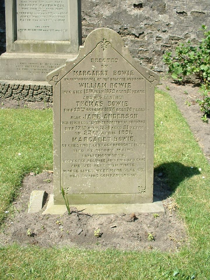 Erected By Margaret Bowie In remembrance of her beloved husband William Bowie who died 18th July 1879 aged 81 years and his brother Thomas Bowie died 29th October 1876 aged 70 years also Jane Anderson her much esteemed and faithful servant died 12th july 1881 aged 81 years on 23rd April 1891 Margaret Bowie of Chestnut Cottage Broughty Ferry died at Niddry Mains Linlithgowshire respected, beloved and full of years and lies here with those whose lives were made glad by her loving companionship