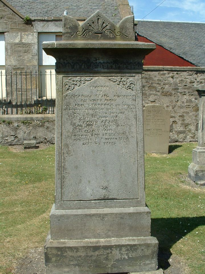 Erected By Alexander Craig Fisherman Broughty ferry and Ann Sturrock his spouse In memory of their children who all died in infancy also of their son David craig who died July 28th 1870 aged 11 years The above Ann Sturrock who died 7th March 1884 aged 62 years
