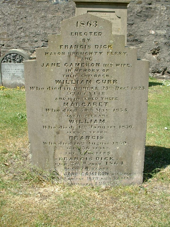 1863 Erected By Francis Dick Mason broughty ferry and Jane cameron his wife In memory of their children William curr who died in Dundee 25th Decr 1825 aged 1 year and is intered there Margaret who died 50th May 1835 aged 5 years William who died 4th January 1836 aged 8 years Francis who died 16th August 1859 aged 56 years The erecters Francis dick died 26th July 1864 aged 70 years and Jane Cameron his spouse died 5th August 1879 aged 92 years also their son Andrew ????