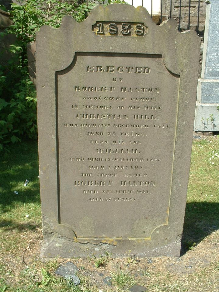 1838 Erected By Robert Hanton Broughty Ferry In memory of his wife Christian Hill who died 17th December 1834 aged 25 years also his son William who died 12th March 1835 aged 4 motnhs _____ The above named Robert Hanton died 25th April 1855 aged 57 years