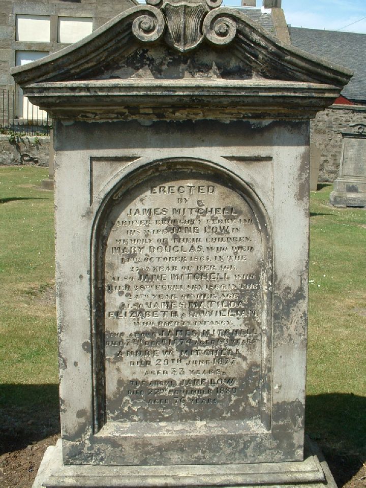 Erected By James Michell Gardner Broughty Ferry and his wife Jane Low in Memory of their children Mary Douglas who died 14th October 1865 in the 27th year of her age also Jane Mitchell who died 28th February 1866 in the 24th year of her age Also James, Matilda, Elizabeth and William who died in infancy The above James Mitchell died 7th Decr 1874 aged 63 years Andrew Mitchell died 29th June 1877 aged 33 years The above Jane Low died 22nd November 1880 aged 76 years