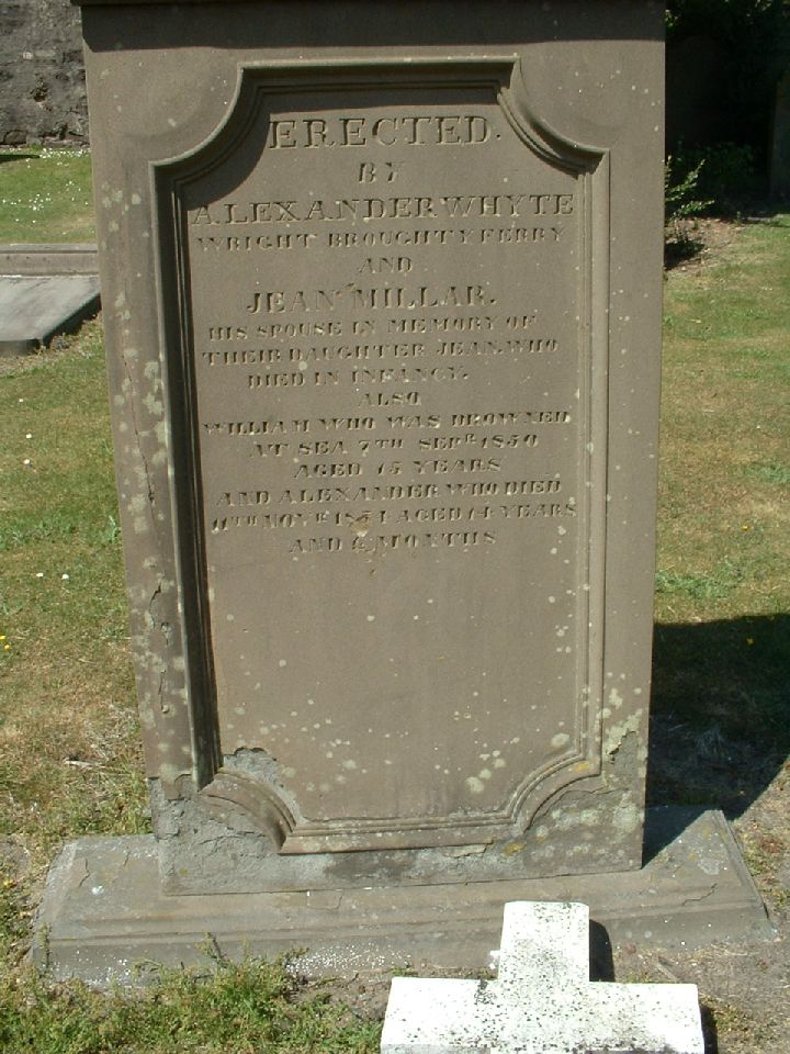 Erected By Alexander Whyte wright Broughty Ferry and Jean Millar his spouse in memory of their daughter Jean who died in infancy also William who was drowned at sea 7th Sepr 1850 aged 15 yeas and alexander who died 11th Novr 1854 aged 14 years and 6 months