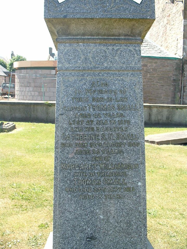 Also In memory of Their son in law Captain Thomas Small Aged 42 years Lost at sea in 1872 And his daughter Catherine S.N. Small Who died 30th August 1900 Aged 35 years And of Margaret Williamson Wife of the above Thomas Small Who died 23rd Sept 1913 Aged 75 years