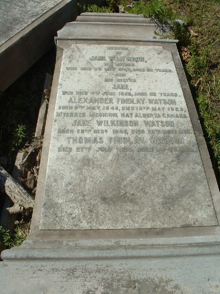 Likewise of Jane Wilkison his mother who died 6th May 1843 aged 68 years and his sister Jane Who died 4th June 1859 aged 39 years Alexander Findlay Watson Born 9th May 1843 Died 18th May 1929 Interred Medicine Hat Alberta Canada Jane Wilkison Watson Born 28th Decr 1847 Died 25th Novr 1933 Thomas Findlay Watson Died 27th July 1936, aged 84 years