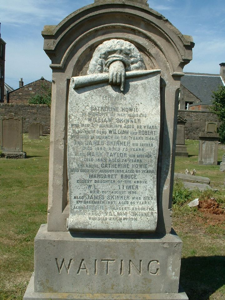 Erected By Catherine howie In memory of her husband William Skinner who died 3rd March 1878 aged 82 years Also their sons William and Robert who died in infancy in the years 1844-5 and James Skinner his father died 1882 aged 73 years also Mary Taylor his mother died 1863 aged 74 years The above catherine Howie who died 5th August 1895 aged 89 years Margaret Bruce Eldest daughter of the above William Skinner died 26th August 1898 also James Skinner who died 2nd december 1807 aged 65 years Also Jessie youngest daughter of the above William Skinner who died 2nd May 1916