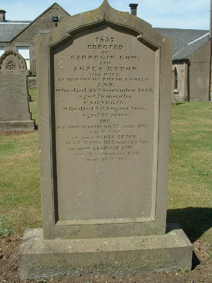 1857 Erected By Carnegie Low and Agnes Etton His wife In memory of their family Ann Who died 25th September 1848 Aged 15 months Carnegie Who died 9th August 1856 Aged 25 years Ann Their grand-daughter died 31st August 1865 Aged 10 years The above Agnes Etton Died 9th April 1885 aged 74 years The above Carnegie Low Died 18th November 1886 In his 86th year