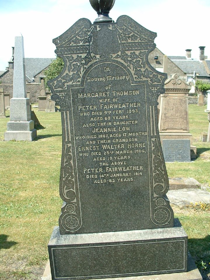 In Loving memory Of Margaret Fairweather Who died 9th Feby 1893 Aged 68 years Also their daughter Jeannie Low Who died 1867 aged 17 months And their grandson Ernest Walker Horne Who died 23rd March 1906 Aged 18 years The above Peter Fairweather Died 14th January 1914 Aged 83 years |