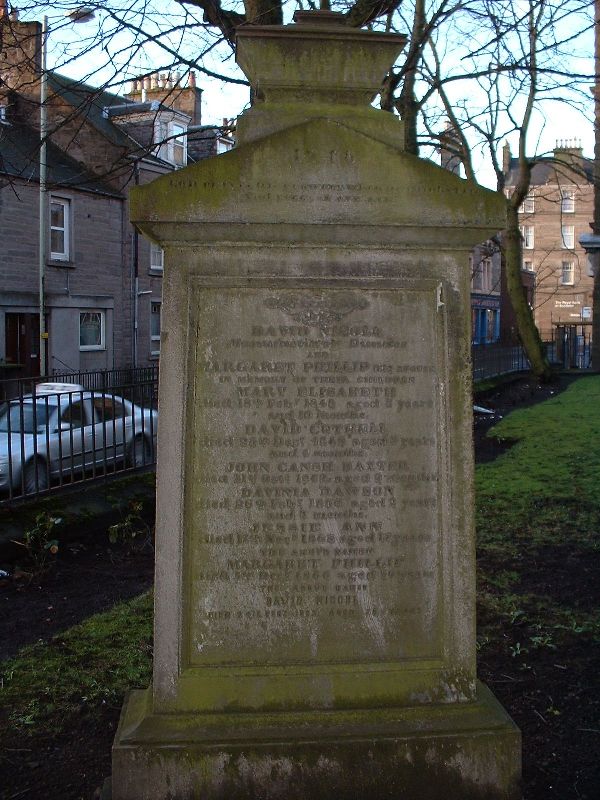 1846 Erected By DAVID NICOLL Manufacturer Dundee and MARGARET PHILIP his spouse in memory of their children MARY ELISABETH died 18th Feby 1845 aged 3 years and 10 months DAVID CUTHELL died 25th Decr 1845 aged 2 years and 4 months JOHN CANSH BAXTER died 31st Octr 1849 aged 9 months DAVINIA DAWSON died 26th Feby 1856 aged 2 years and 9 months JESSIE ANN died 12th Novr 1863 aged 17 years The above named MARGARET PHILLIP died 5th Decr 1866 aged 56 years The above named DAVID NICOLL died 24th Feby 1883 aged 76 years