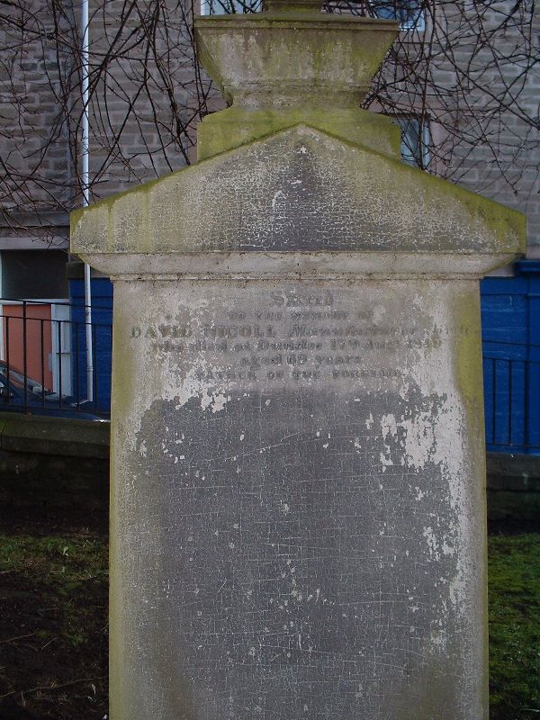 Sacred to the memory of DAVID NICOLL Manufacturer Airth who died at Dundee 17th Aug 1849 aged 69 years father of the former