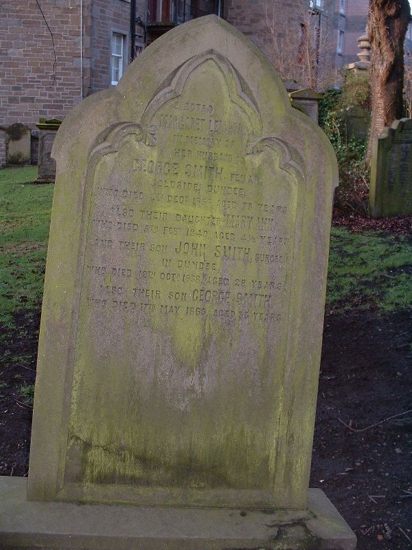 Erected by MARGARET LEIGHTON in memory of her husband GEORGE SMITH Feuar Coldside Dundee who died 2nd Decr 1856 aged 75 years also their daughter MARY ANN who died 5th Feby 1840 aged 4 1/2 years and their son JOHN SMITH surgeon in Dundee who died 12th Octr 1858 aged 28 years also their son GEORGE SMITH who died 17th May 1865 aged 33 years