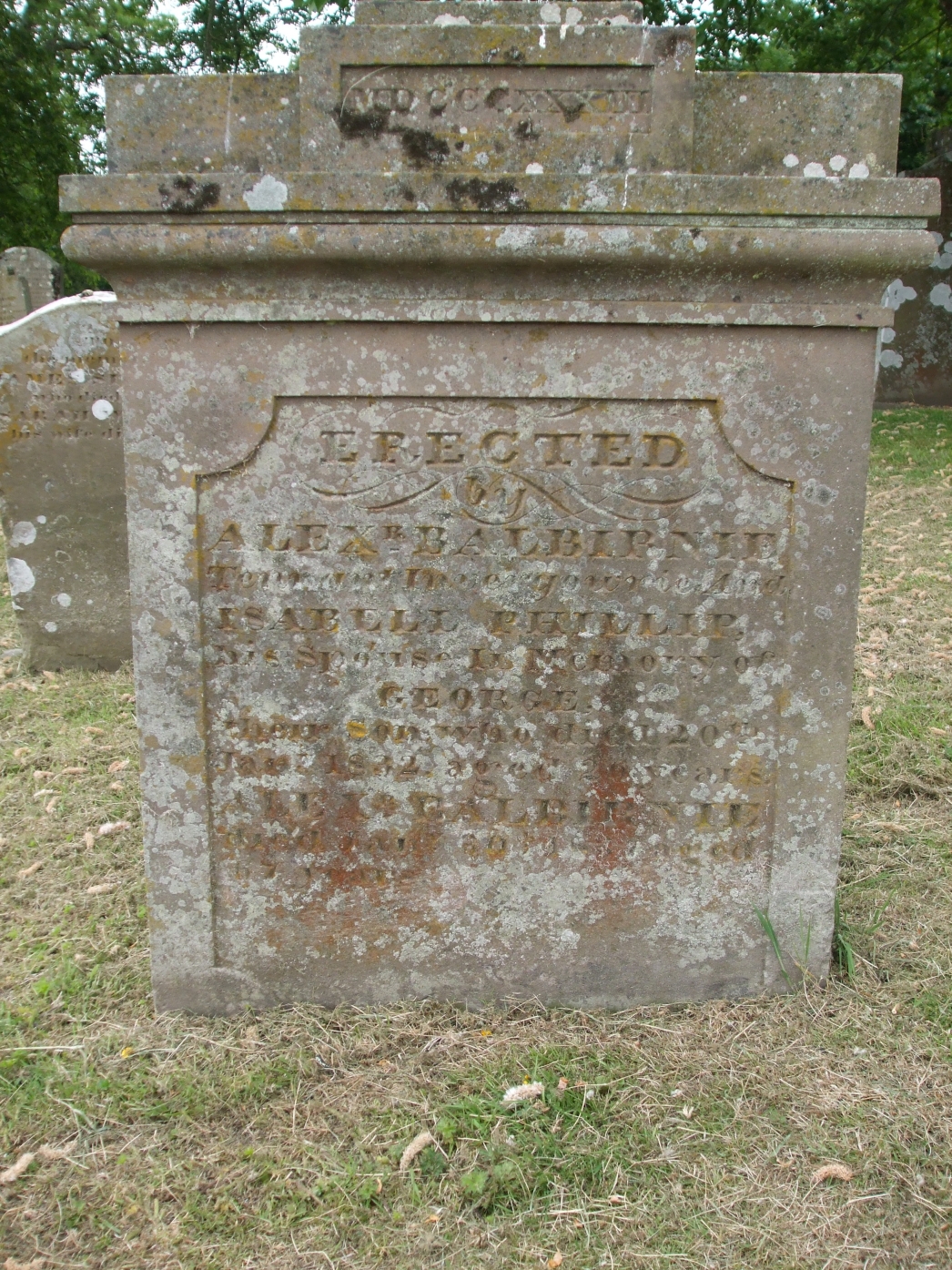 MDCCCXXXIIIErectedByAlexr BalbirnieTennant, Invergowrie andIsabell PhillipHis spouse in memory ofGeorgeTheir son who died 20thJany 1832 aged 20 yearsAlexr Balbirniedied Jany 30th 1837 aged67 years
